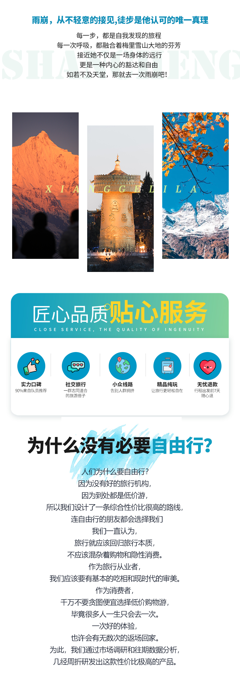 ● 行程中涉及的相關(guān)景點(diǎn)景色因受天氣、季節(jié)變化等情況影響,無(wú)法保證與活動(dòng)介紹中的展示保持一致,游客報(bào)名即表示知曉并理解本情況。