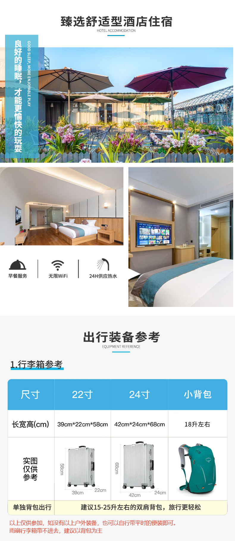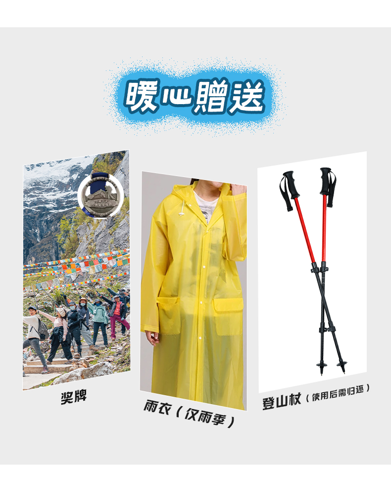 1、裝備:每人飲用水1瓶、一次性雨衣1件(僅限雨季)、戶(hù)外魔術(shù)頭巾1條、登山杖2支(為了環(huán)保,我們鼓勵(lì)領(lǐng)隊(duì)回收登山杖,希望得到您的理解和支持);