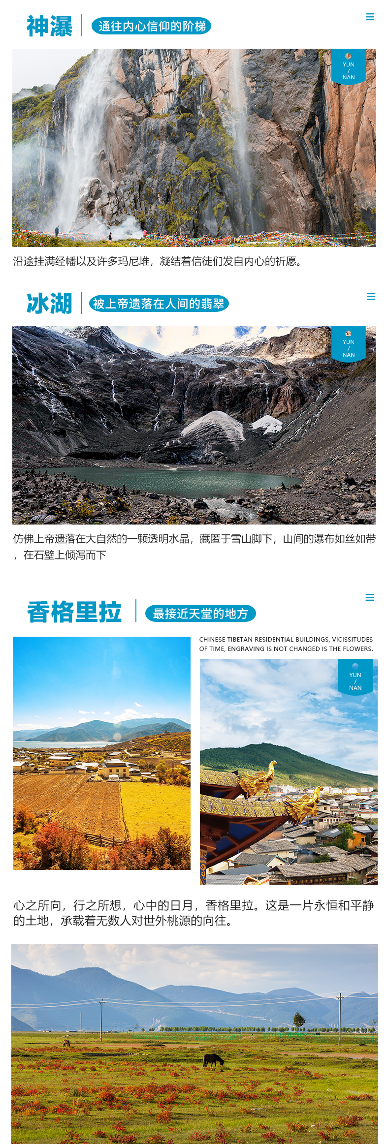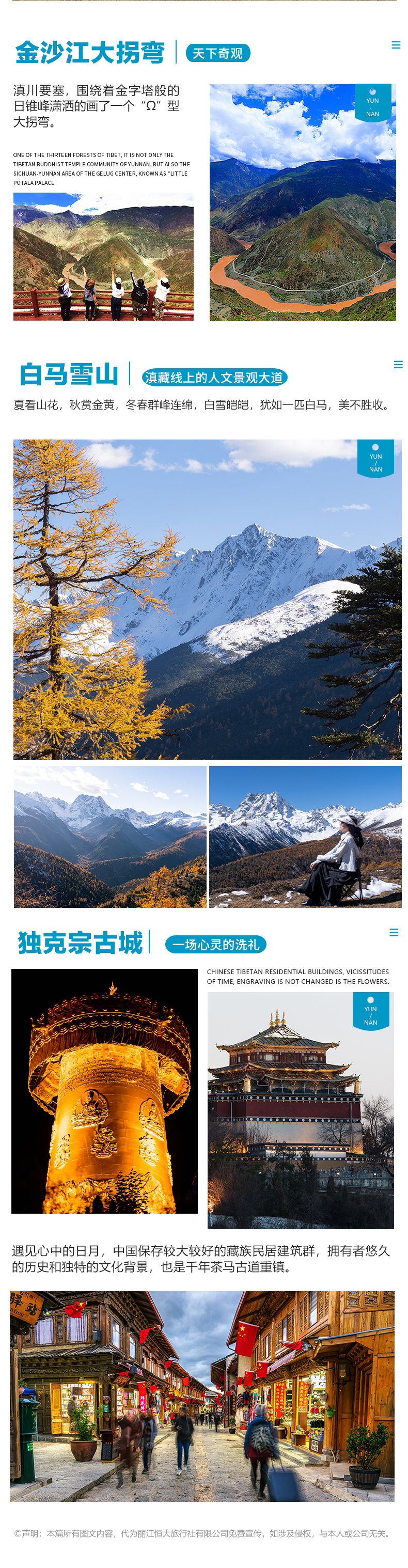 麗江→獨(dú)克宗古城→依拉草原→奔子欄→金沙江月亮灣→白馬雪山→飛來(lái)寺
