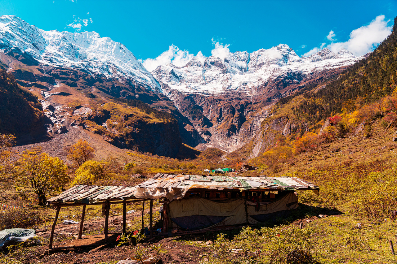 清晨用完早餐后, 從雨崩村出發(fā),經(jīng)高海拔原始森林及杜鵑叢林,徒步將近2小時(shí)后翻過(guò)海拔3900米的上那宗拉埡口,直至雨崩河底隨后穿過(guò)一片原始松樹(shù)林,約1小時(shí)后抵達(dá)海拔3600米的中日聯(lián)合登山隊(duì)“笑農(nóng)大本營(yíng)”。1991年由中日聯(lián)合登山隊(duì)修建而成,是登梅里雪山卡格博峰的一個(gè)大本營(yíng),去雨崩村旅游必去的一個(gè)地方,風(fēng)景優(yōu)美。
