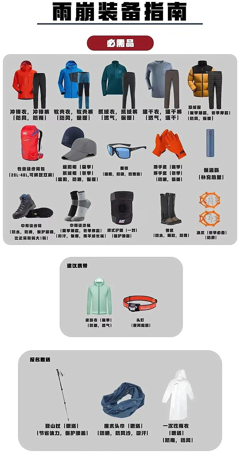 服裝:白天速干衣+軟殼/硬殼沖鋒衣,早晚溫差大需添加羽絨服/厚抓絨(冬季)。