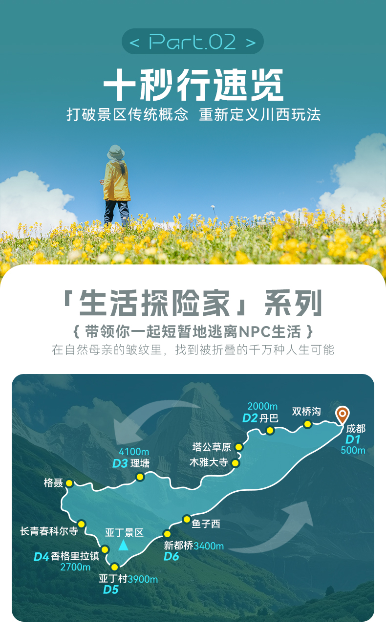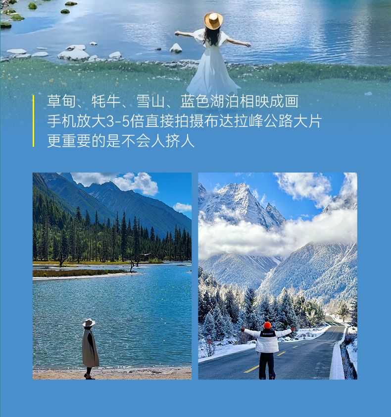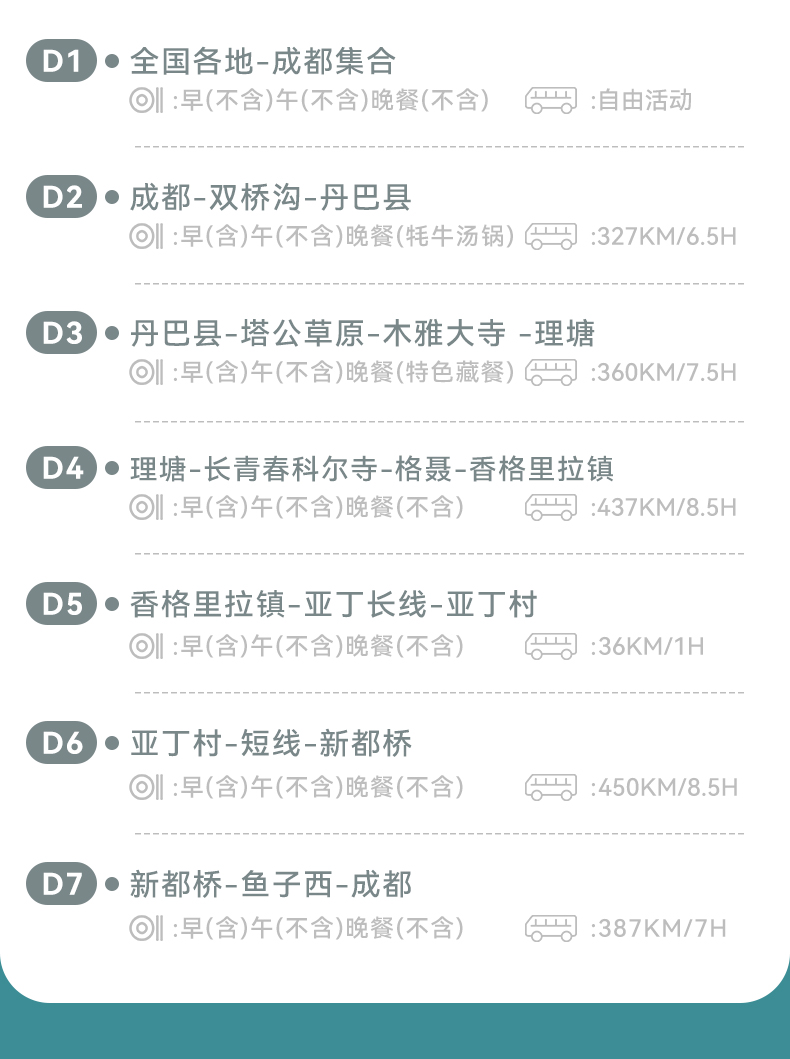 行程概覽:早餐后從新都橋出發(fā),迎著清晨的第一縷陽光前往360°觀景平臺【魚子西】,觀貢嘎雅拉等雪山群,拍照打卡。之后翻越4200米的折多山埡口,沿成雅高速回到成都,結束愉快的旅程。山水有相逢,愿我們下次再見,扎西得嘞!
