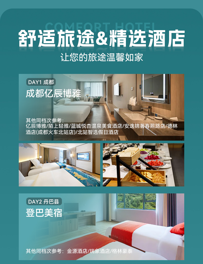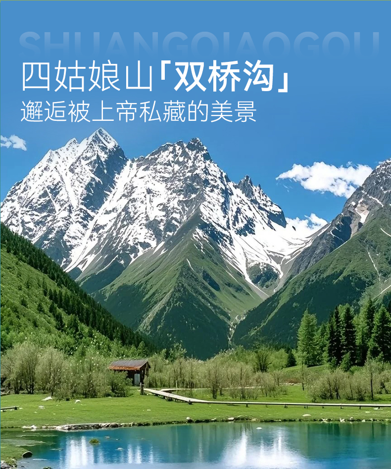 行程概覽:早上從成都酒店出發(fā),沿中國熊貓大道而上,然后經(jīng)過貓鼻梁,這里是一處免費觀看四姑娘山全景的觀景臺,在這個位置遠眺四位可愛的仙女,中午抵達【四姑娘山鎮(zhèn)】,午餐后景區(qū)雙橋溝景區(qū)游玩,結束后前往丹巴縣城入住,結束今天的行程。