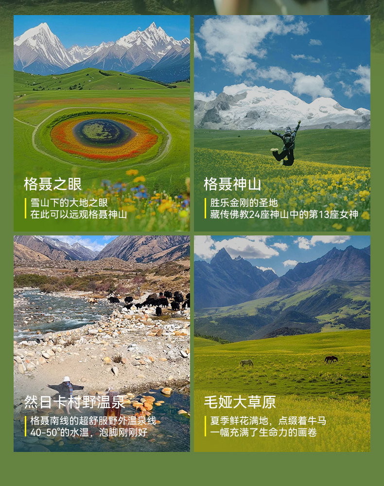 1、交通:全程包車往返,根據(jù)人數(shù)選擇合適車型;含魚子西中轉車;格聶之眼中轉車。