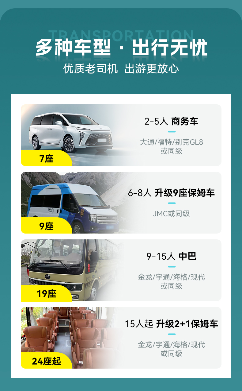 常規(guī)團團型:24人封團,8人及以上安排專業(yè)導游帶隊,15人及以上升級2+1保姆車