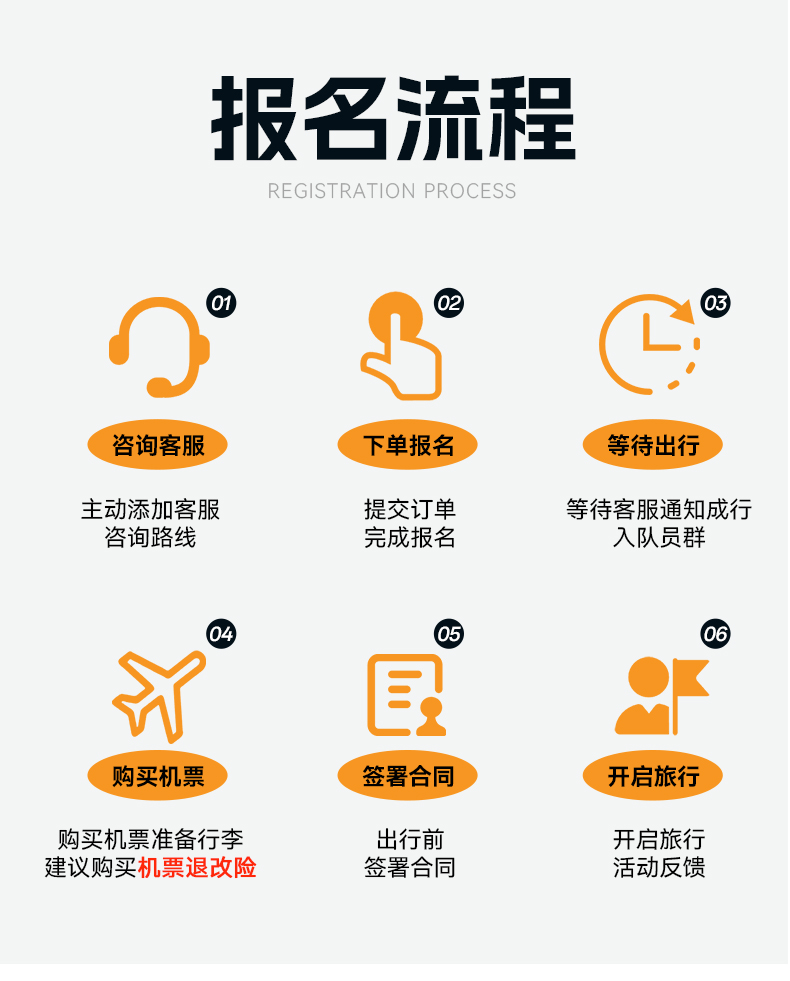 1、仔細閱讀各項活動說明,全面了解行程。 2、提交真實姓名以及身份證號碼以便購買保險。 3、準時到達活動的集合地址,有任何問題可撥打客服電話。 4、保持手機通暢,以便領隊能及時聯(lián)系上您。 |
