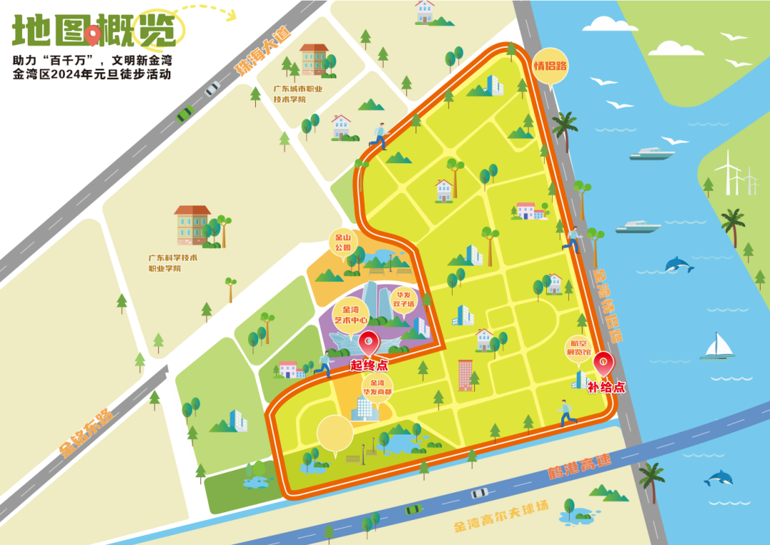 金灣藝術中心→金山公園→金灣情侶路→航展規(guī)劃館→中心河濕地公園→金灣藝術中心,活動全程約5KM,到達終點后有序自行解散。
