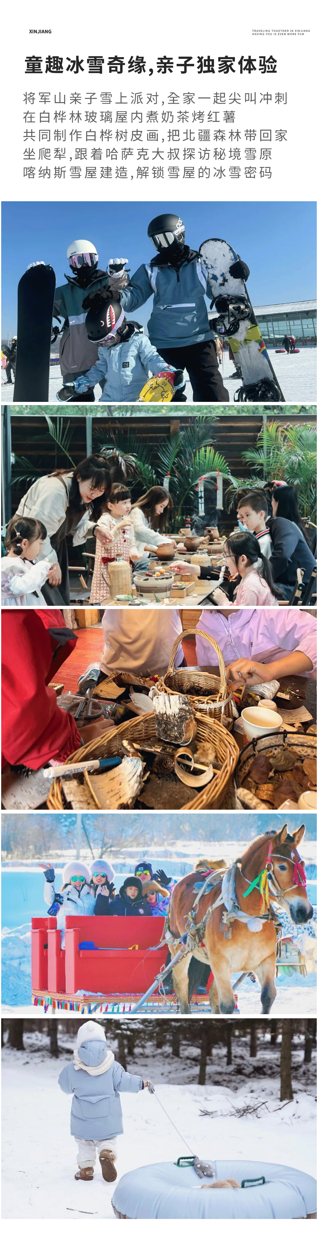 之后前往景區(qū)入住山莊,即可開始享受禾木的冬天。冬季的禾木銀裝素裹,白雪皚皚,一片白雪與灰色白樺林的映襯,顯得那么安靜與反差。在這里體驗圍爐煮茶,看大雪滿天,它又回歸到本就屬于這里的靜謐和純凈。小朋友們還可以前往與小鹿來一個親密互動,攝影師會為我們記錄下美好的瞬間。