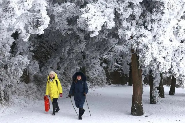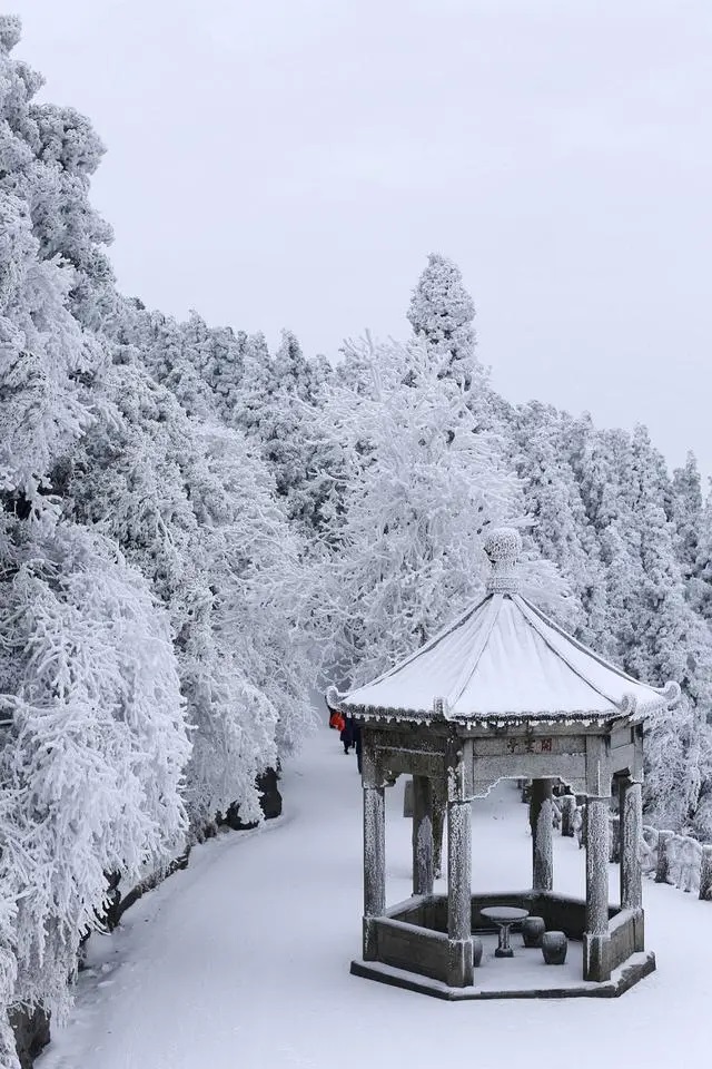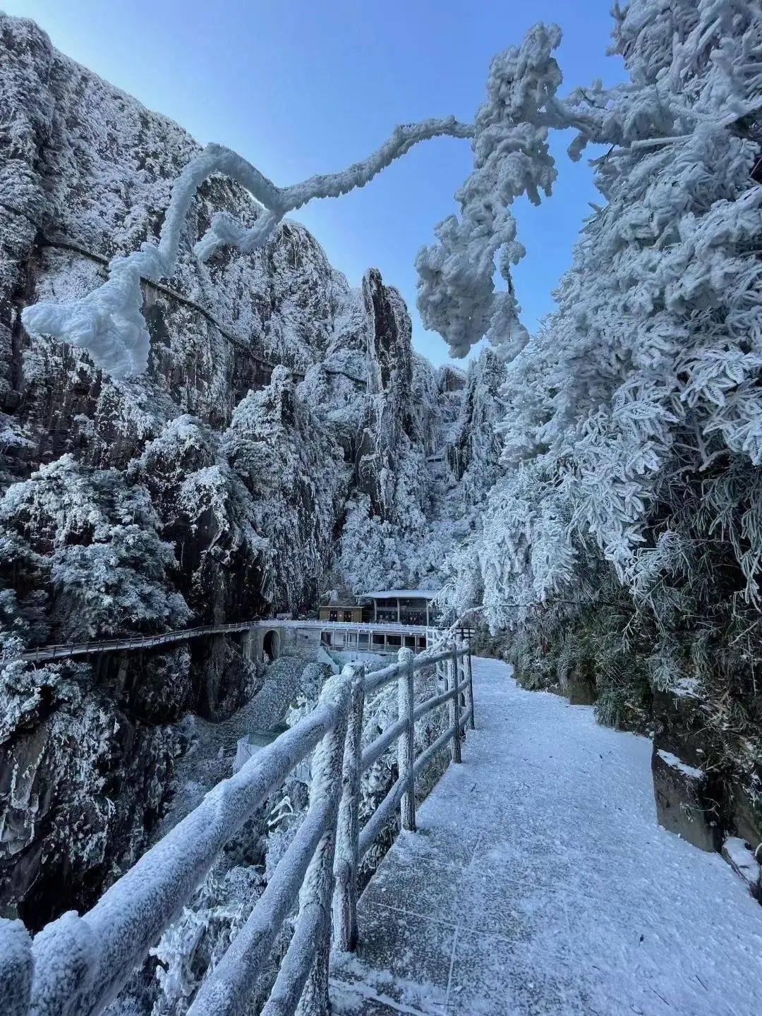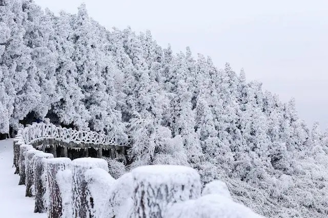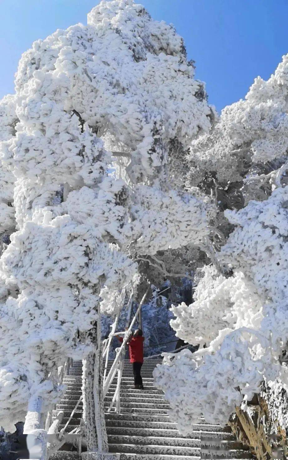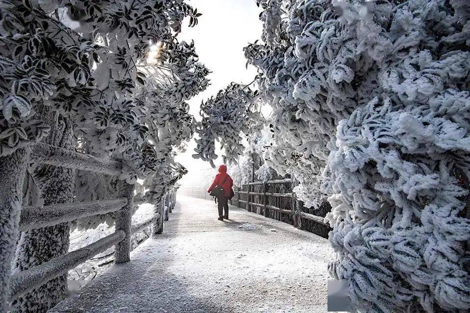 冬天的衡山,皚皚白雪覆蓋著莽莽群山,山路兩旁綿延的霧凇雪景如夢如幻,雪樹銀花讓衡山變成了仙宮玉闕,晶瑩剔透的冰雪霧凇把整個景區(qū)裝扮成浪漫的冰雪童話世界。