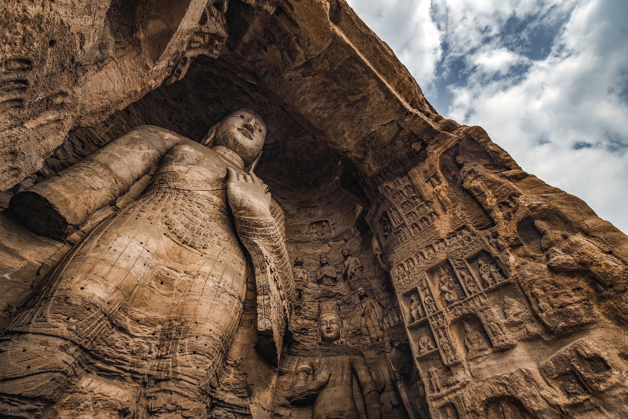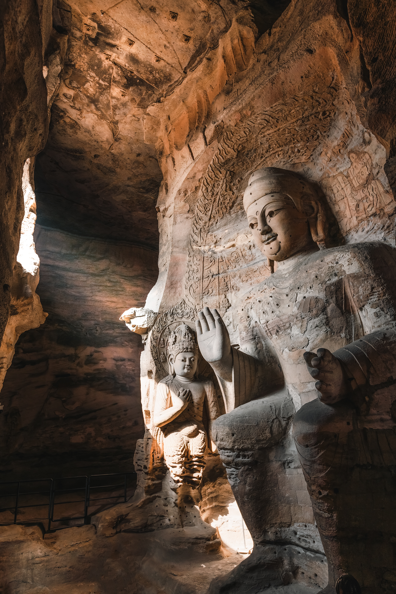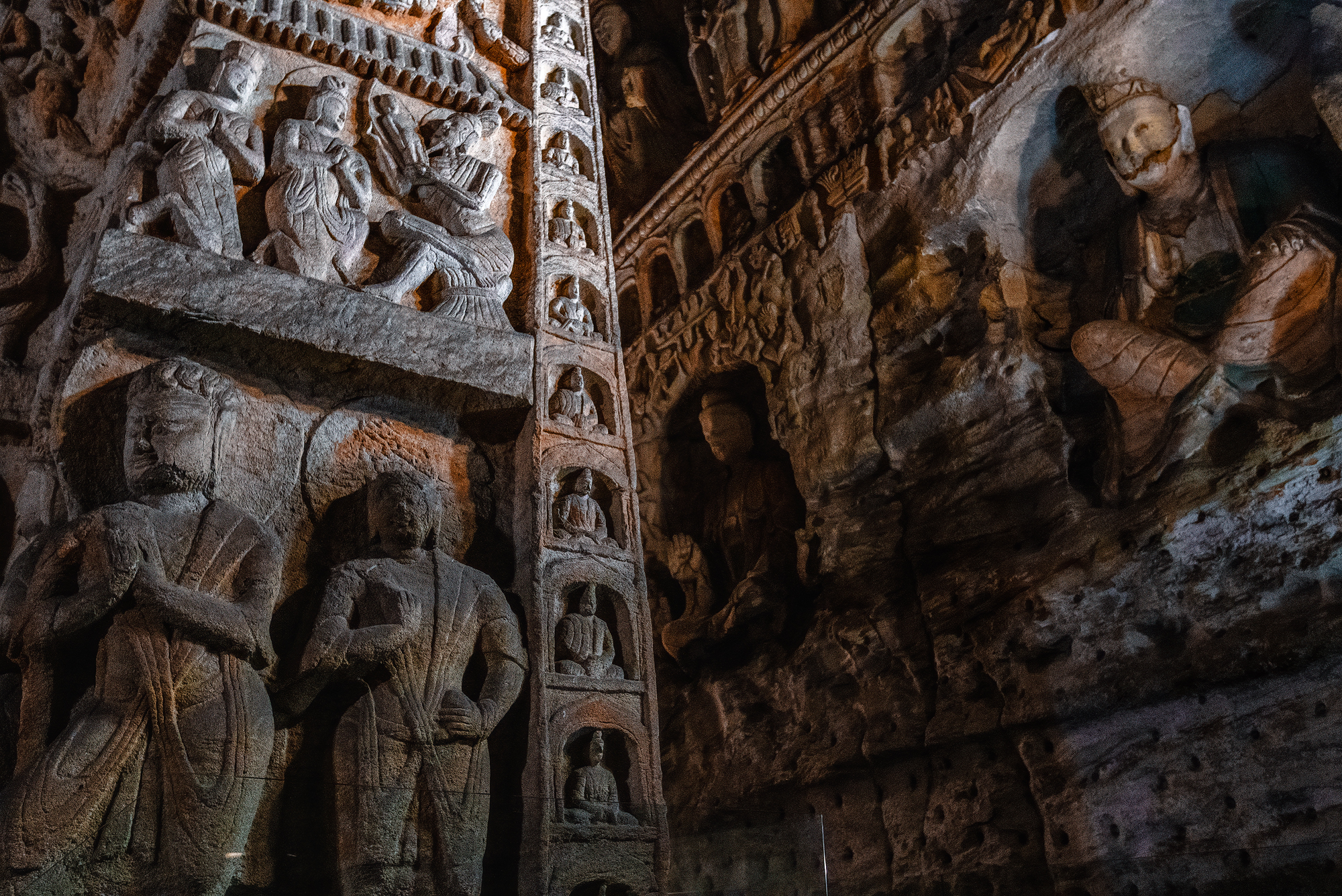 隨后,我們來到中國四大石窟之一的【云岡石窟】。這里是色彩藝術(shù)的集大成者,更是浮雕藝術(shù)的巔峰。陽光下神圣的露天大佛、令人眼光繚亂的蓮花藻井都深藏歷史的厚重。抬頭仰望,這里的一鑿一石是古人造就的不朽文明,時間帶不走它的悲憫,它卻能輕易把你帶回千百年前的北魏。